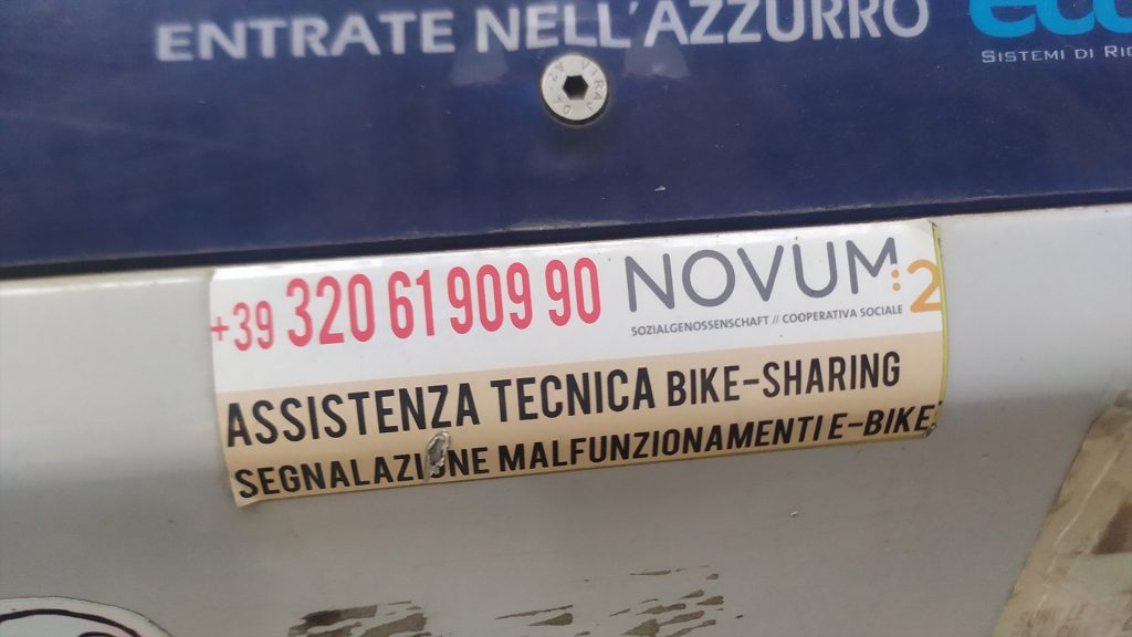 Non c’è da sorprendersi quindi se a molti il sistema di Bike-Sharing risulta talmente macchinoso da scoraggiarne l’utilizzo – e in tutto questo, le poche biciclette disponibili e l’evidente stato di trascuratezza di alcune ciclostazioni non aiuta. Una impressione che ci viene confermata da una nostra lettrice. Scrive la signora Elisa: “abito in Piazza Gries e sarebbe molto comodo poter prendere la bici per andare in stazione e poi prendere il treno. Mi sono regolarmente iscritta nel sito. Non ho caricato il conto, perché non mi fidavo del sistema. E ho fatto bene. Ho provato ad attivare l’Alto Adige Pass per prendere la bici, ma il totem di Piazza Gries non dà alcun segno di vita. Ho così contattato Ecospazio facendo presente che il totem di Piazza Gries non reagisce all’Alto Adige Pass e non mi hanno mai più risposto. Ma io mi chiedo: il Comune non poteva fare come in tutta Italia una convenzione con Ridemovi: una VERA app (attiva p.es. a Padova e a Bologna, ndr), attivabile in pochi minuti, funzionante perfettamente in tutto il paese?”.